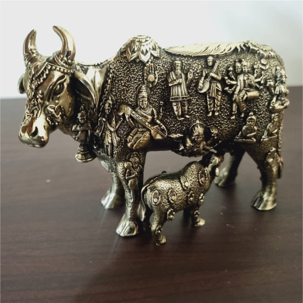 A beautifully crafted brass idol of Kamadhenu, the divine wish-fulfilling cow from Hindu mythology, adorned with intricate carvings of various deities and sages. This sacred sculpture symbolizes abundance, divinity, and the presence of all gods within.